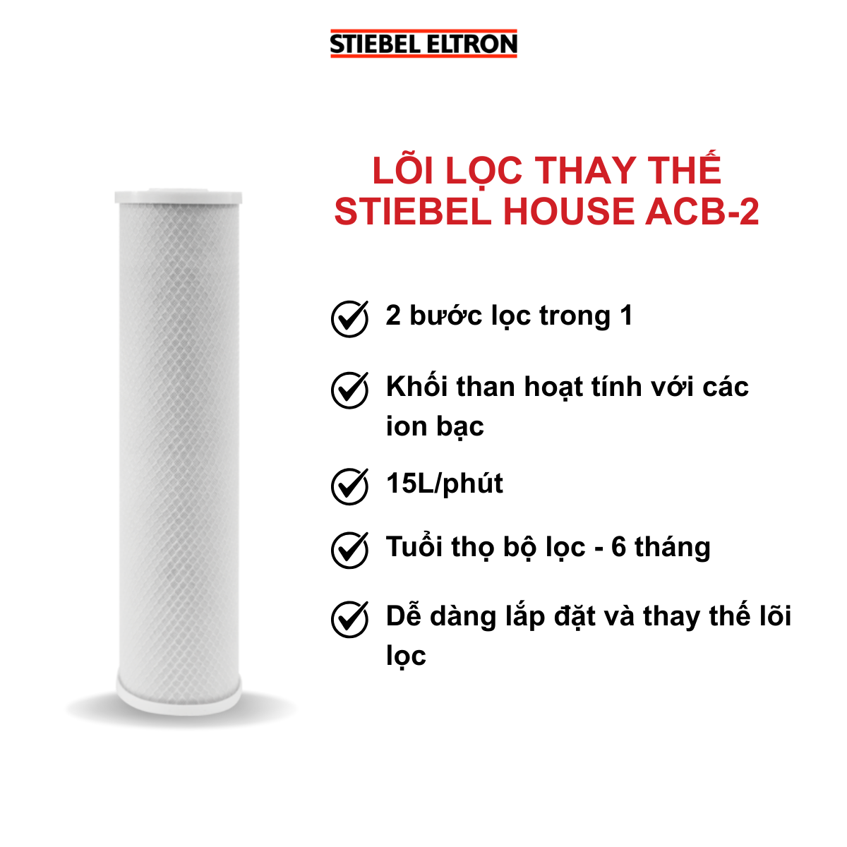 *** THÔNG SỐ KỸ THUẬT STIEBEL HOUSE ACB FILTER CARTRIDGE (VN) 'Chiều dài củalõi lọc: 20 Inch Các công đoạn lọc: 2 Cấp bậc Cấp lọc 1: Khối than hoạt tính có môi trường bạc kháng khuẩn - 5 μm * Thời gian thay bộ lọc: 06 tháng tuỳ theo nguồn nước sử dụng.