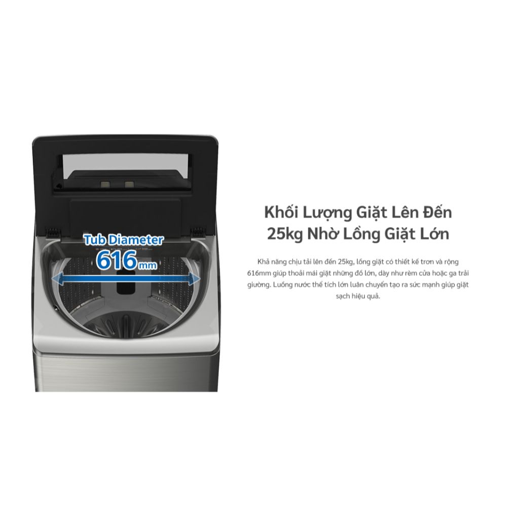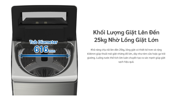 🔷 Dung tích 25 kg: Đặt trong một thiết kế lồng đứng gọn gàng, phù hợp cho nhu cầu giặt lớn.