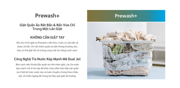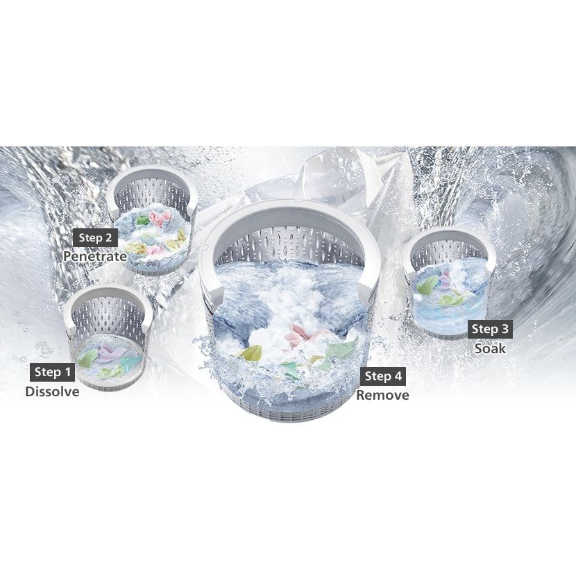 🔷 Công nghệ Giặt 4 Bước & Tia nước kép (Dual Jet): Tăng cường hiệu quả hòa tan bột giặt và thẩm thấu, giúp đánh bật vết bẩn cứng đầu nhờ cơ chế phun nước mạnh mẽ.