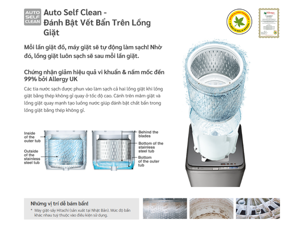 🔷 Auto Self Clean (Tự động Vệ sinh Lồng giặt): Công nghệ độc quyền được Chứng nhận Allergy UK, tự động làm sạch lồng giặt sau mỗi lần dùng, chống nấm mốc hiệu quả.