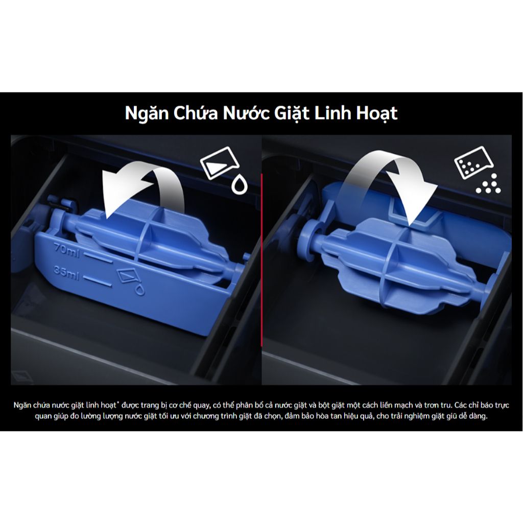 🔷 Hệ thống Thác nước Đôi (Dual Waterfall): Hai luồng nước mạnh mẽ đổ xuống từ hai bên lồng giặt, giúp hòa tan bột giặt nhanh chóng và thẩm thấu sâu vào quần áo, tăng cường hiệu quả làm sạch và hạn chế cặn bột giặt.