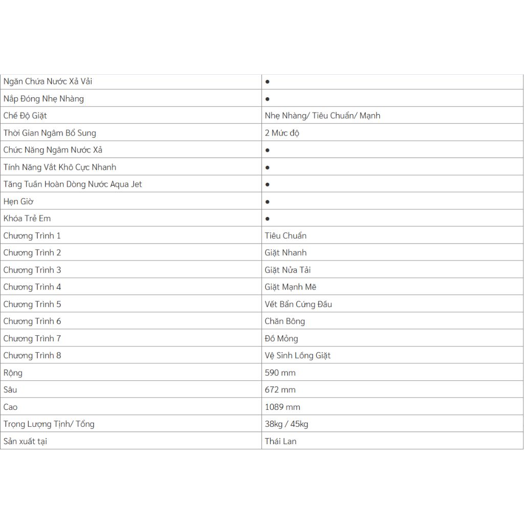 | Số chương trình giặt | Khoảng 8 chương trình (Thường có: Giặt tiêu chuẩn, Giặt nhanh, Giặt nhẹ, Giặt chăn, Giặt sơ, Giặt mạnh,...) |