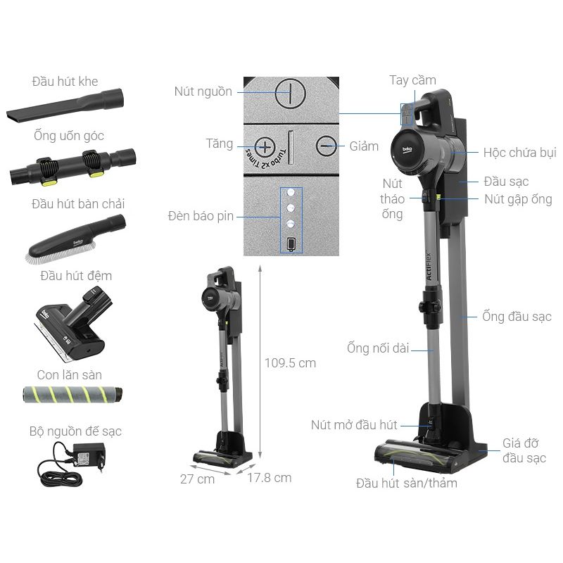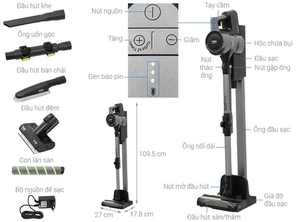 | Phụ kiện đi kèm | - Đầu hút khe - Đầu hút bàn chải - Đầu hút đệm - Đầu hút sàn/thảm |