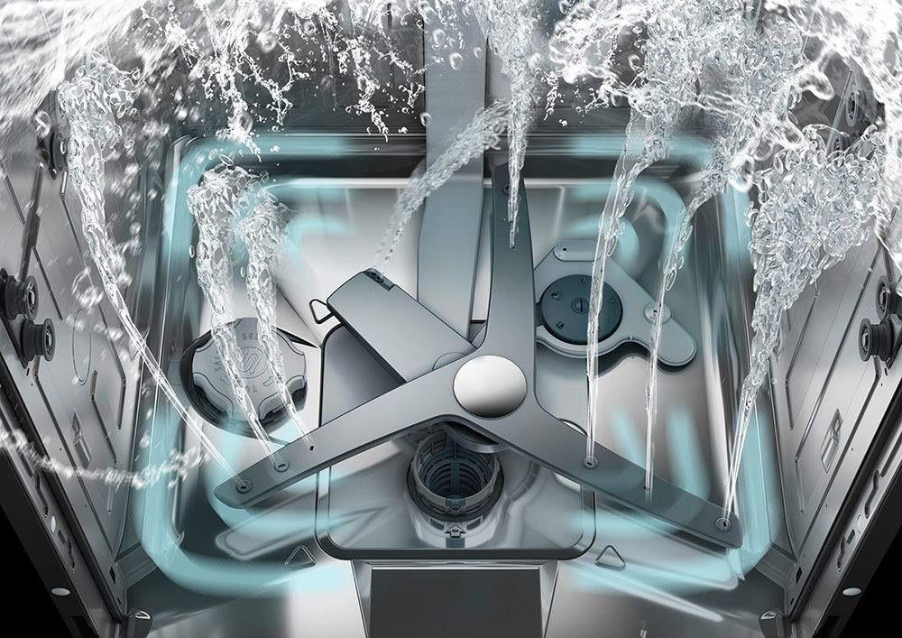🔷 Cơ chế: Hệ thống tay phun được thiết kế đặc biệt giúp luồng nước tiếp cận mọi ngóc ngách bên trong khoang máy.