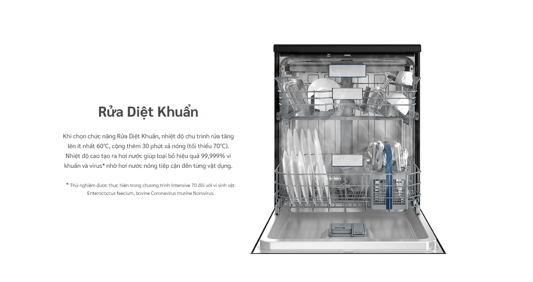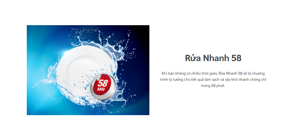 🔷 Lợi ích: Hoàn thành toàn bộ chu trình rửa và sấy chỉ trong 58 phút ở nhiệt độ cao (60°C), mang lại hiệu quả làm sạch tối đa trong thời gian ngắn nhất.