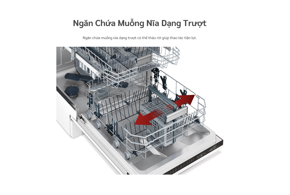 🔷 Lợi ích: Giúp sắp xếp muỗng, nĩa, dao, kéo và các vật dụng nhỏ (như tách espresso) một cách khoa học, giúp tia nước tiếp cận mọi bề mặt để làm sạch tốt hơn, đồng thời giải phóng thêm không gian cho nồi chảo ở khay dưới.