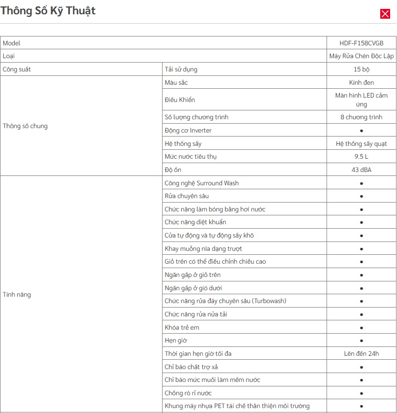 📋 THÔNG SỐ KỸ THUẬT CHI TIẾT (MODEL HDF-F158CVGB)
