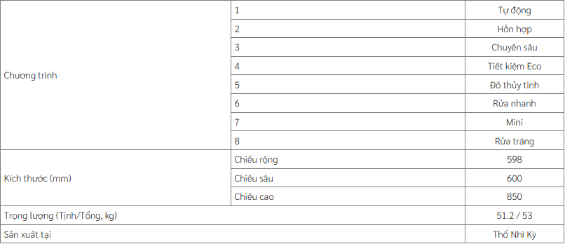 Công nghệ Surround Wash ● Rửa chuyên sâu ● Chức năng làm bóng bằng hơi nước ● Chức năng diệt khuẩn ● Cửa tự động và tự động sấy khô ● Khay muỗng nĩa dạng trượt ● Giỏ trên có thể điều chỉnh chiều cao ● Ngăn gấp ở giỏ trên ● Ngăn gấp ở gió dưới ● Chức năng rửa đáy chuyên sâu (Turbowash) ● Chức năng rửa nửa tải ● Khóa trẻ em ● Hẹn giờ ● Thời gian hẹn giờ tối đa Lên đến 24h Chỉ báo chất trợ xả ● Chỉ báo mức muối làm mềm nước ● Chống rò rỉ nước ● Khung máy nhựa PET tái chế thân thiện môi trường ●