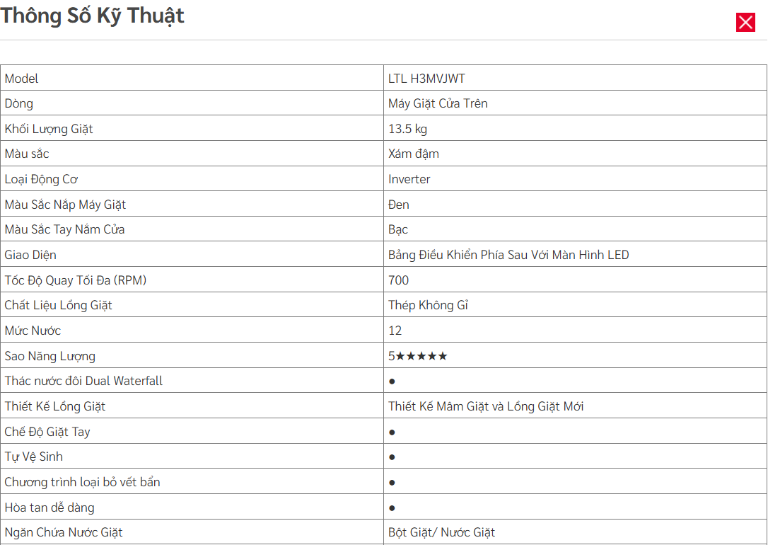 📋 THÔNG SỐ KỸ THUẬT CHI TIẾT (MODEL LTL-H3MVJWT)