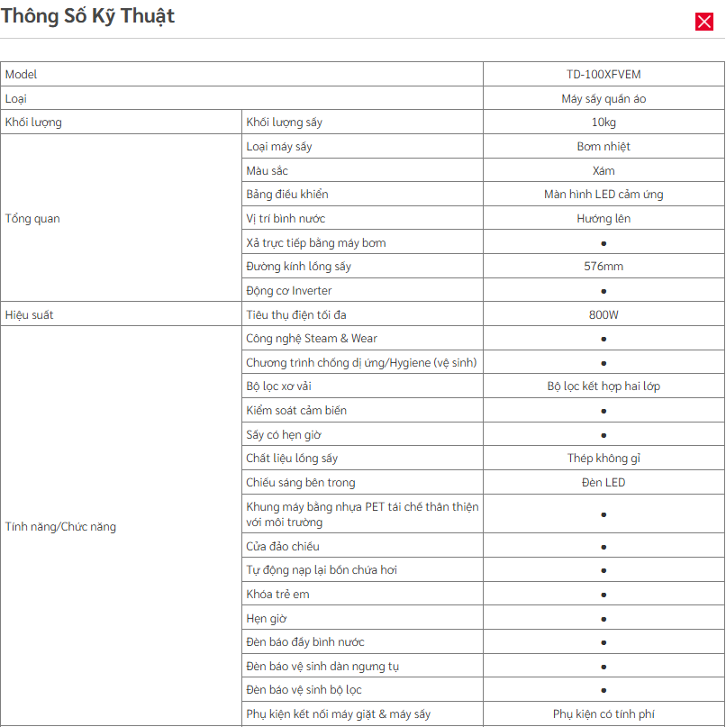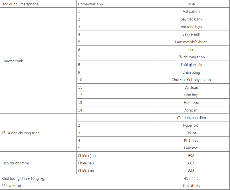 | Công nghệ nổi bật | Steam & Wear (Sấy hơi nước) |