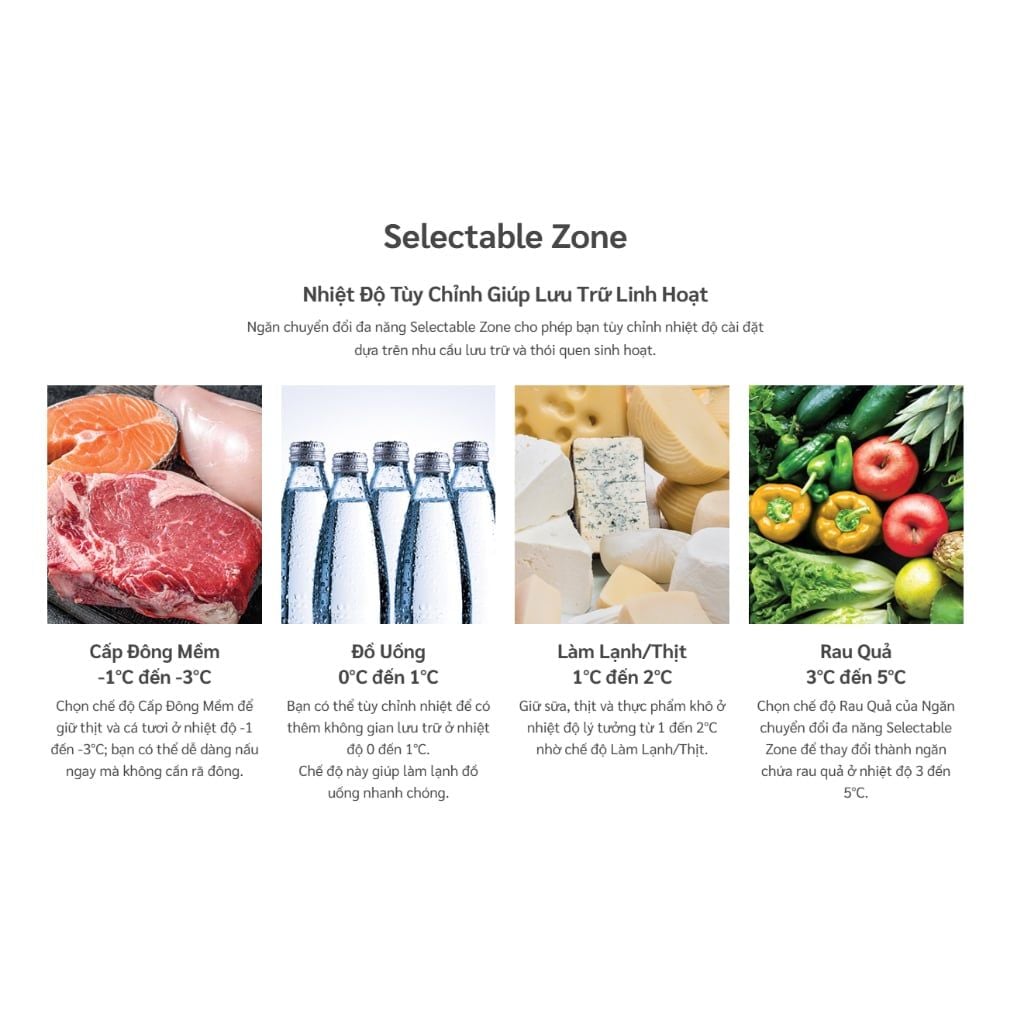 🔷 Rau Quả (3°C đến 5°C): Chọn chế độ Rau Quả của Ngăn chuyển đổi đa năng Selectable Zone để thay đổi thành ngăn chứa rau quả ở nhiệt độ 3 đến 5°C.