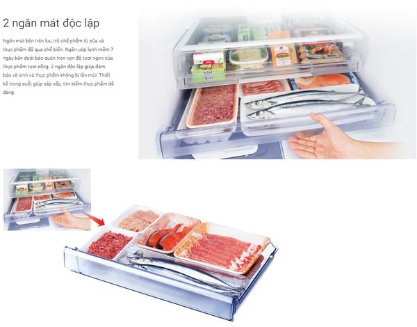 🔷 Lợi ích: Mỗi ngăn có hệ thống làm lạnh riêng, giúp duy trì nhiệt độ và độ ẩm tối ưu cho từng loại thực phẩm, đồng thời ngăn chặn hoàn toàn việc lây nhiễm mùi chéo giữa đồ tươi sống và rau quả.