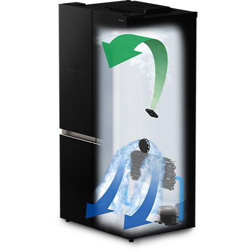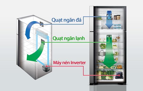 🔷 Hệ thống quạt kép (Dual Fan Cooling): Làm lạnh độc lập ngăn đông và ngăn mát, giúp kiểm soát nhiệt độ chính xác và ngăn chặn tình trạng lẫn mùi thực phẩm.